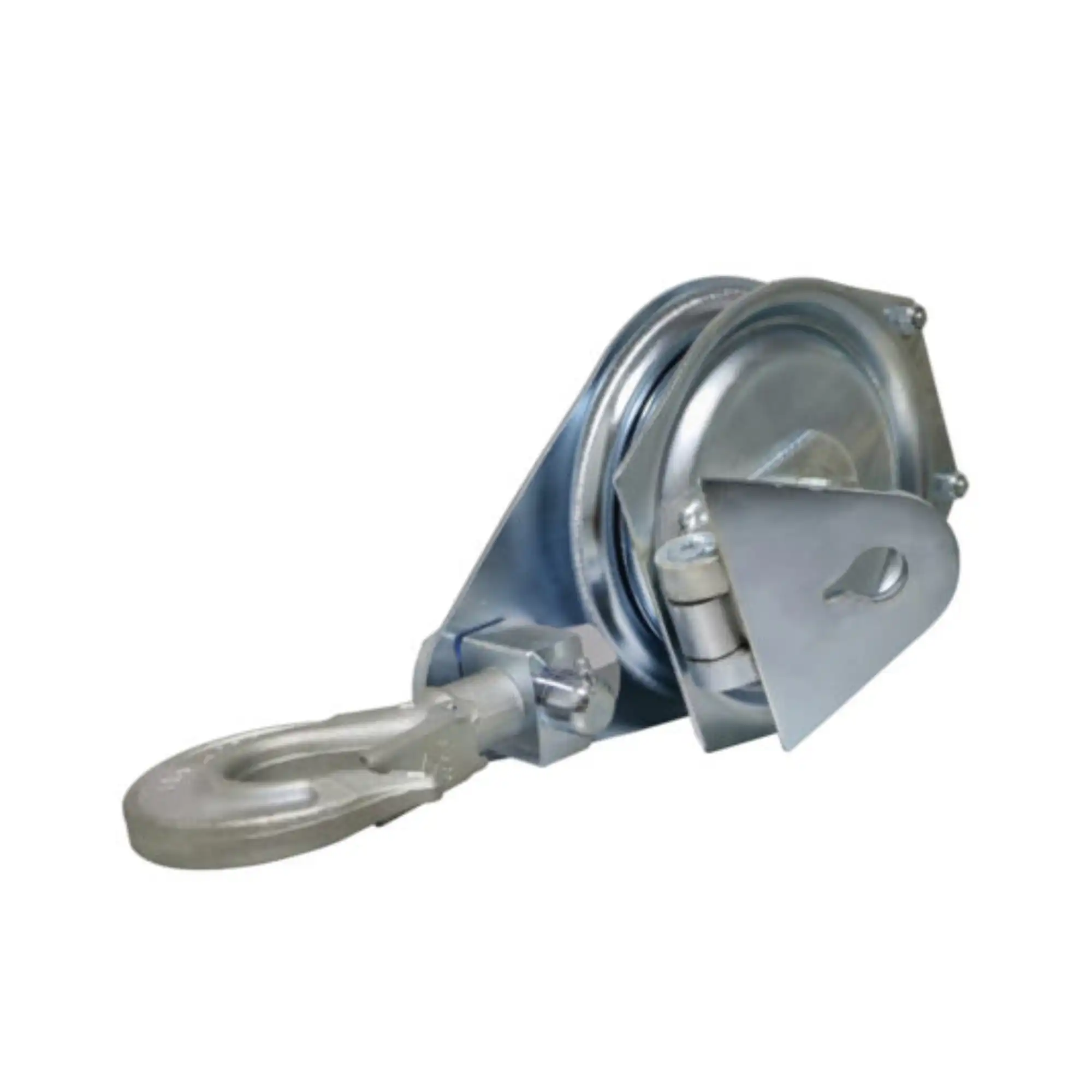 Snatch block with steel sheave on ball-bearings, galvanized steel frame with hinged side-flap opening, twisting hook attachment G1 type with safety latch provided in the standard version.