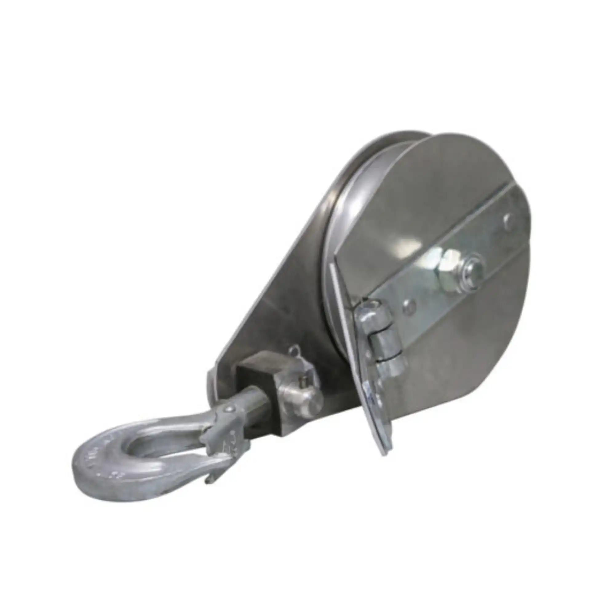 Snatch block with aluminum sheave on ball-bearings, aluminum frame with hinged side-flap opening, twisting hook attachment G1 type with safety latch provided in the standard version.