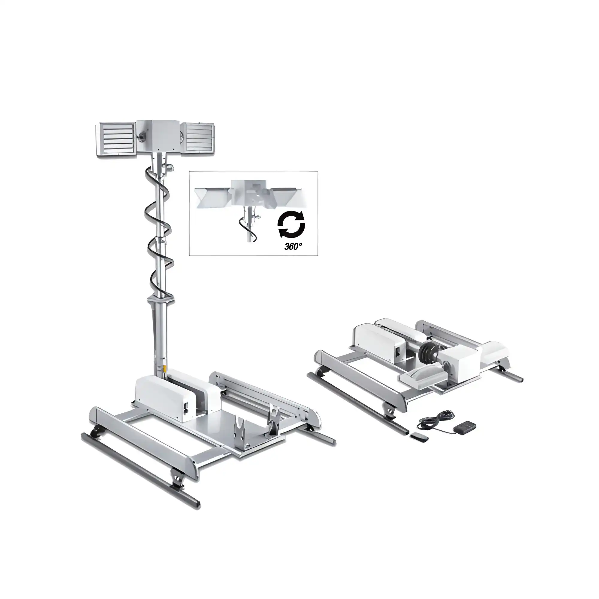 The mast height is adjustable up to 1.8m. The movements of extension, 360° rotation and lamps inclination are controlled by two wireless and wired remote controllers, 4 electric motors (12V or 24V) and micro pneumatic air compressor integrated in the base.