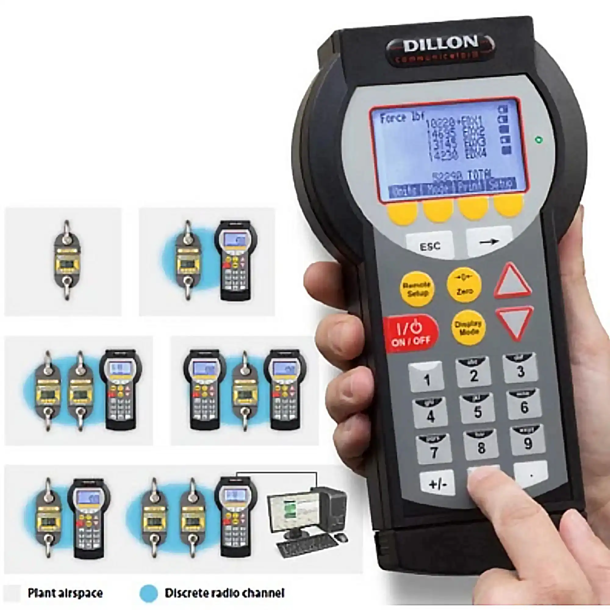 Through the programmable SOFTKEY interface, one or more Communicators can monitor multiple dynamometers within the same airspace. In multiple-link lifting arrays, the Communicator can display readings at any or all lift points and calculate the total load.