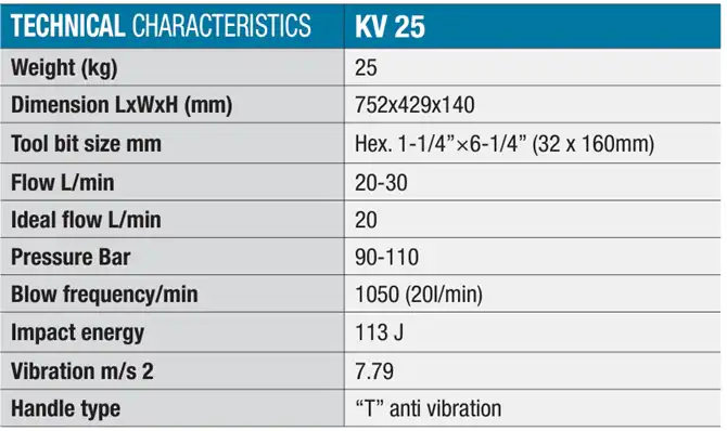 The KV25 hydraulic breaker comes with “T type” anti-vibration handles suspended on springs and ergonomically designed for the comfort of the operator. It is well suited for general demolition works, the breaking of concrete and asphalt cutting. Our KV25 gives the best compromise between high power and maneuverability, it can be powered by a power pack or the hydraulic circuit of a mini excavator, SSL, truck/van, or other machines with a sufficient hydraulic circuit. The hydraulic system assures quietness and productivity, eliminating the typical problems associated with the transport and performance of bulky air compressors and pneumatic breakers.