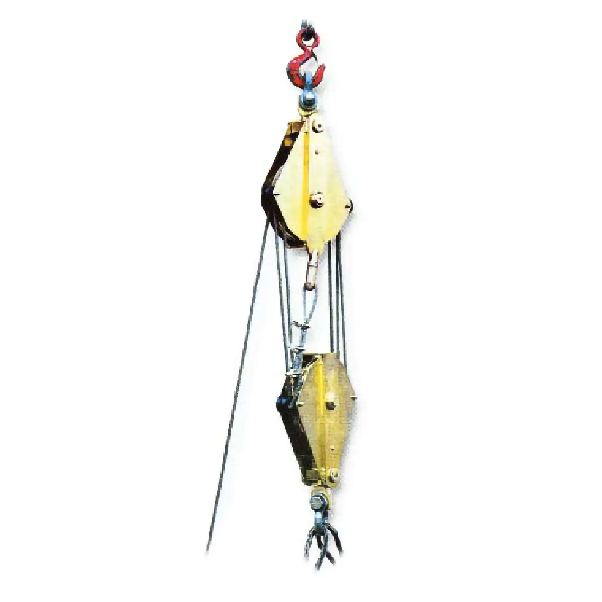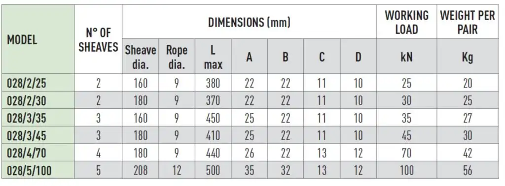 Lifting/pulling Tackles with steel sheaves mounted on ballbearings, galvanized steel frame, suitable for 9mm steel wire.