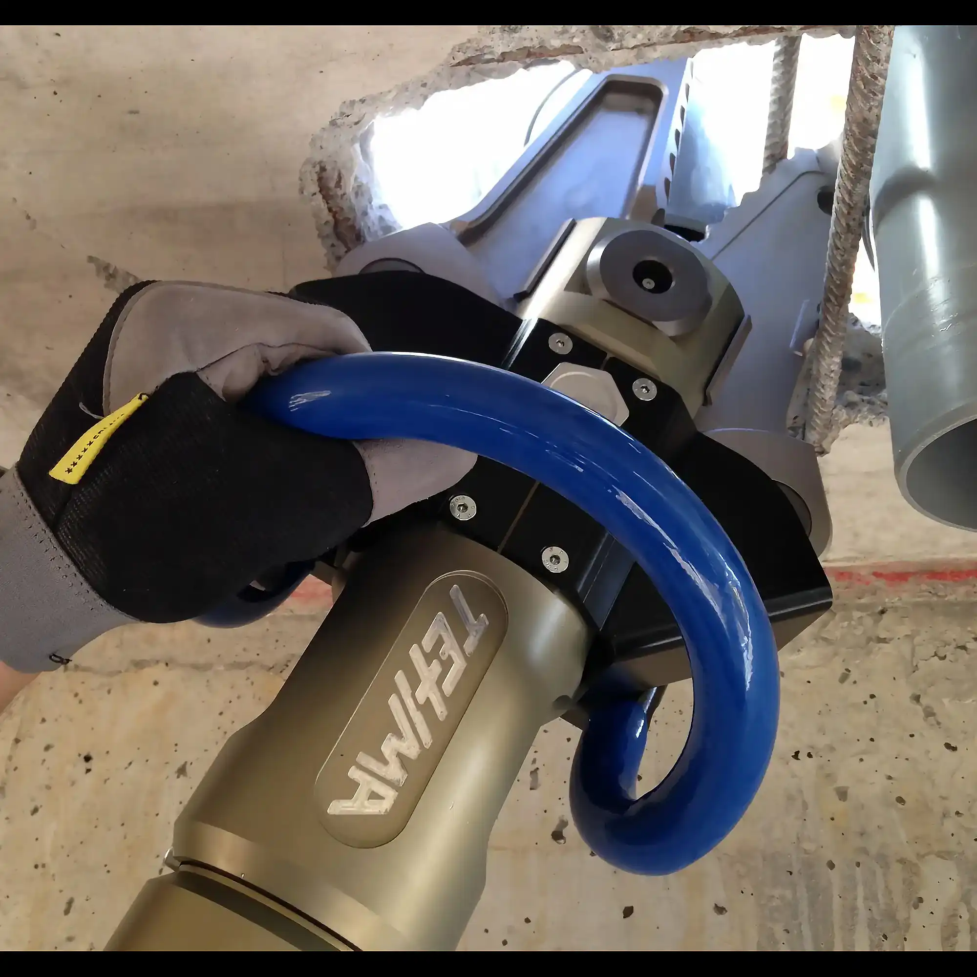 Quick separation of blocks of reinforced concrete structures previously demolished. (by means of Tehma CC300 concrete crusher or Tehma SP400 hydraulic concrete and rock splitter).